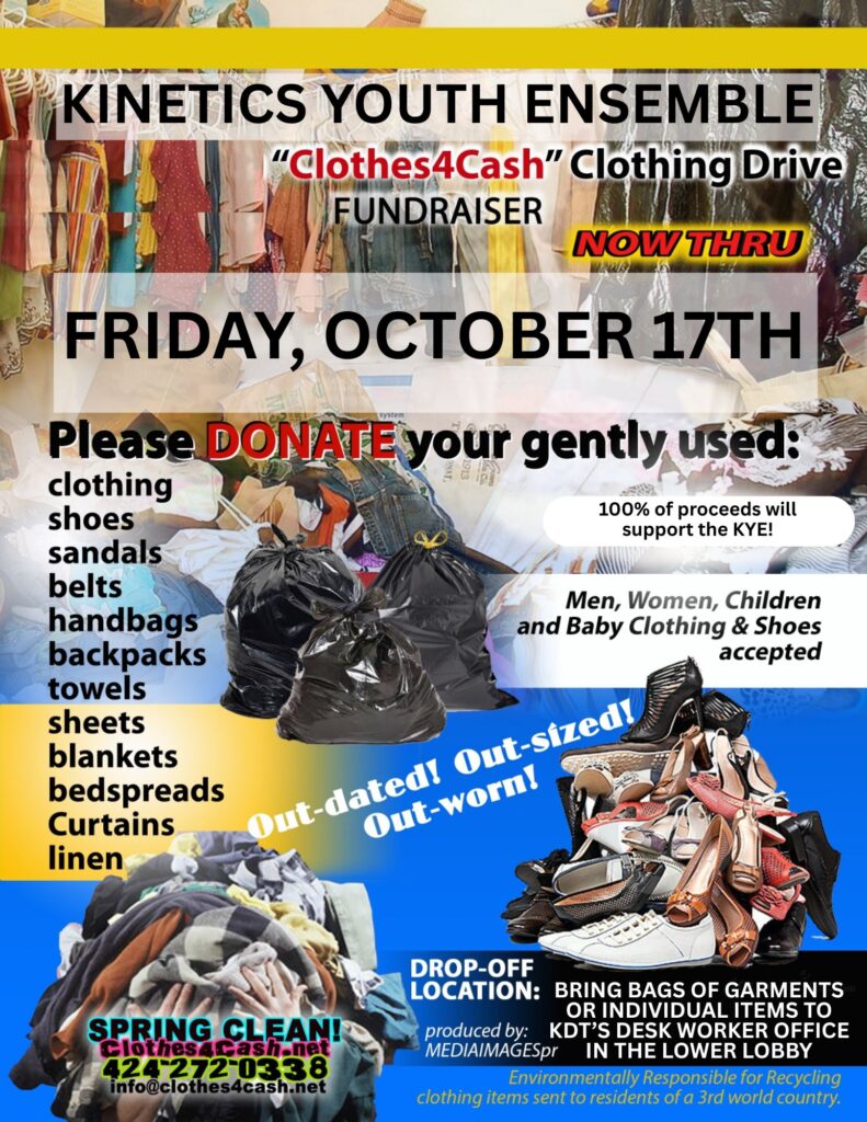 Doing some Fall cleaning? Support our Kinetics Youth Ensemble by donating gently used clothing and other items! Drop off items or bags of items in the downstairs desk worker office at KDT between October 1st and 17th. Please encourage your friends and family members to drop off items as well!