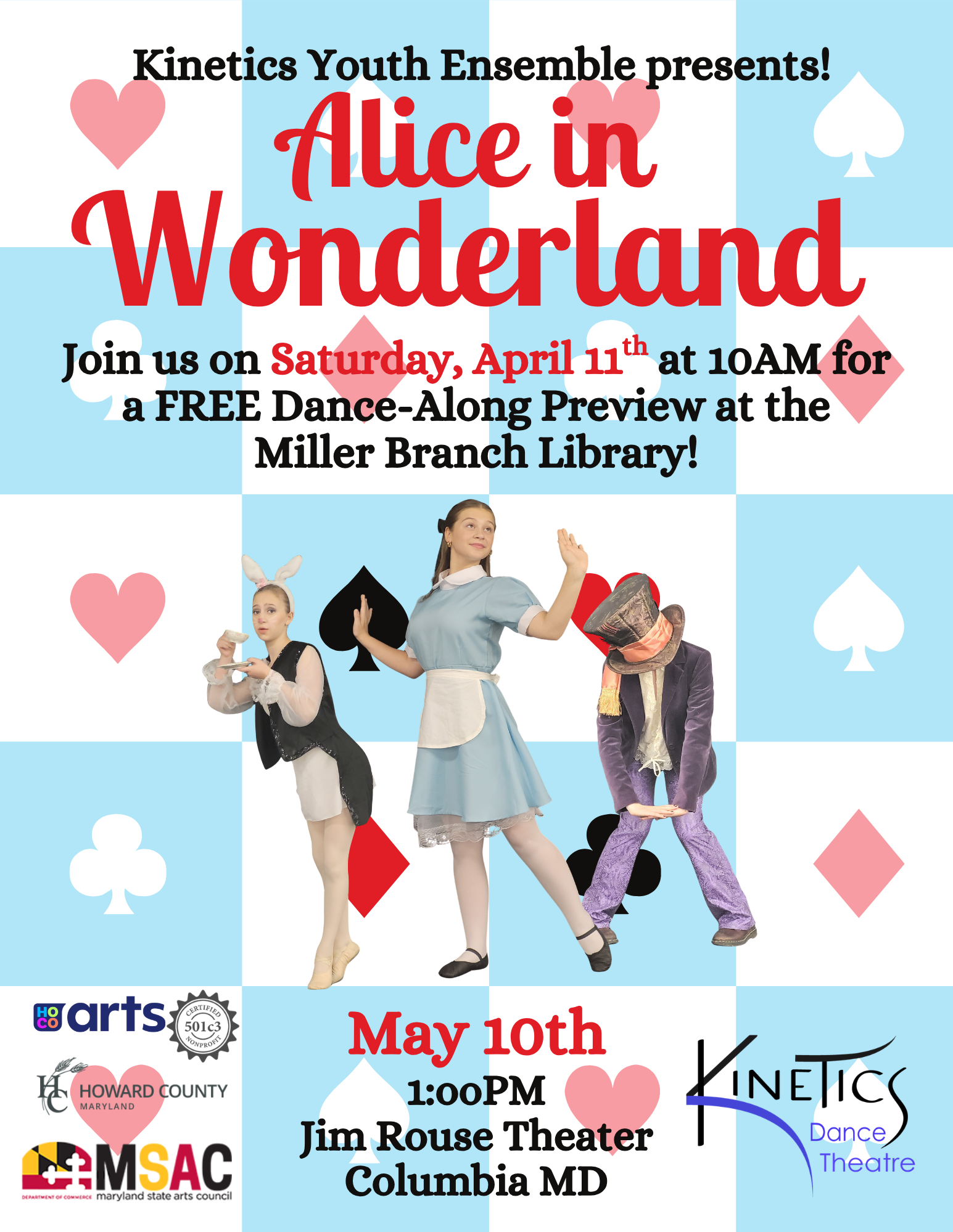 Get a sneak peek of the KYE’s production of Alice in Wonderland this Saturday, April 11th at 10am at the Miller Branch Library! Join some of our characters for a FREE interactive preview of the show!