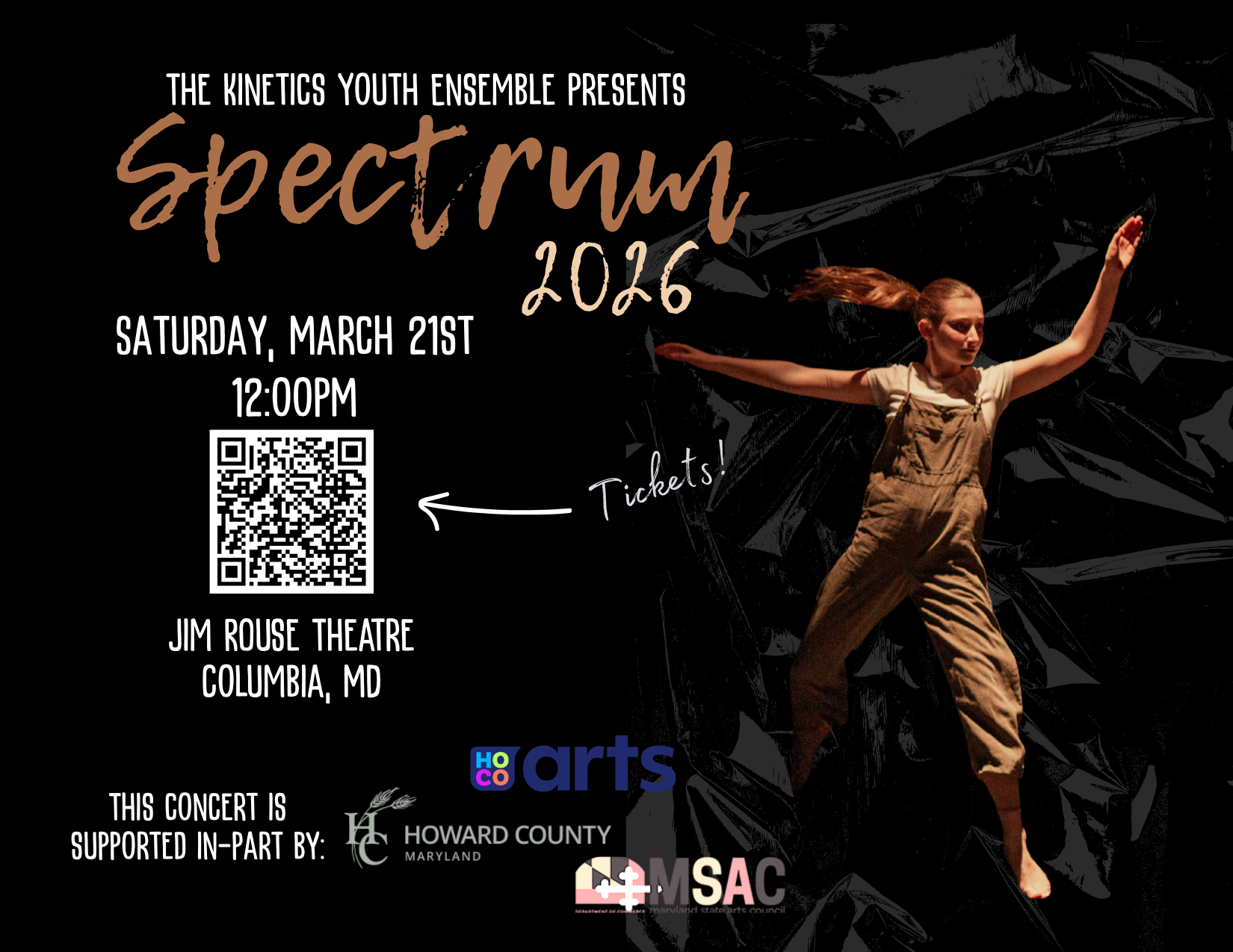 Spectrum is an annual concert that presents a rich repertoire of dance works performed by Kinetics Youth Ensemble students in grades 4 to 12. This concert will feature 7 premiere and 2 returning KYE dance works. Spectrum displays a wide array of themes, emotions and styles within the umbrella of contemporary dance. This performance is expected to run approximately one hour and includes a brief intermission. This concert is suitable for all ages, but is recommended for audiences ages 8 and older.